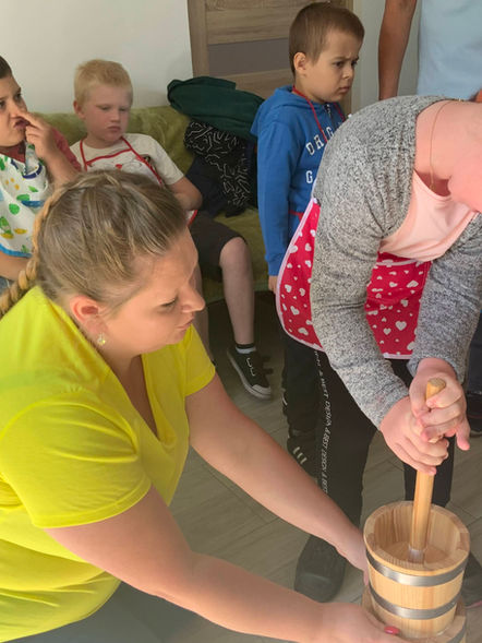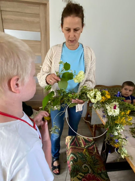 w piękne stroje ludowe, przekazały dzieciom wiedzę na temat ludowych zwyczajów i tradycji. Dzieci mogły zapoznać się z domowym sposobem wyrabiania masła, zbierania ziół oraz zaprezentowały jak pleść wianki. Dzieci samodzielnie robiły masło, wiły wieńce, chodziły po ścieżce sensorycznej. Stymulacja wielozmysłowa wprowadziła nas w magiczną krainę wsi. Zapach ziół i smak chleba z masłem ukoił nasze zmysły. Zajęciom towarzyszyły przyśpiewki ludowe.